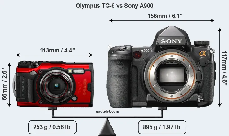 The side-by-side display below illustrates the physical size and weight of the Olympus TG-6 and the Sony A900. The two cameras are presented according to their relative size. Three consecutive perspectives from the front, the top, and the back are available. All width, height and depth measures are rounded to the nearest millimeter.