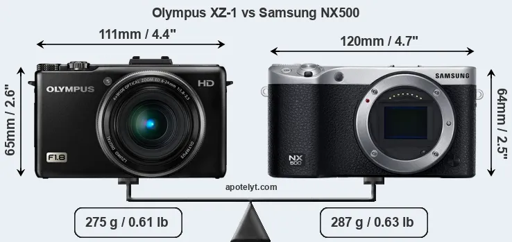 An illustration of the physical size and weight of the Olympus XZ-1 and the Samsung NX500 is provided in the side-by-side display below. The two cameras are presented according to their relative size. Three successive views from the front, the top, and the rear are shown. All width, height and depth dimensions are rounded to the nearest millimeter.