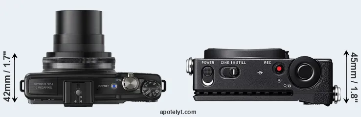 If the front view area (width x height) of the cameras is taken as an aggregate measure of their size, the Sigma fp is notably larger (10 percent) than the Olympus XZ-1. It is noteworthy in this context that the fp is splash and dust-proof, while the XZ-1 does not feature any corresponding weather-sealing.
