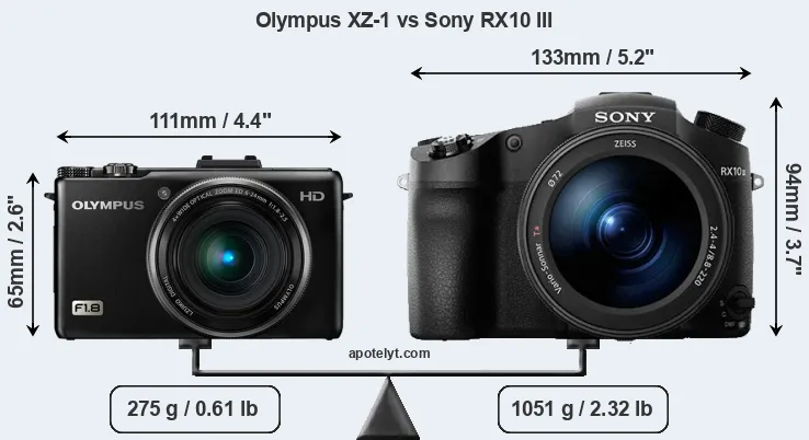 If the front view area (width x height) of the cameras is taken as an aggregate measure of their size, the Sony RX10 III is considerably larger (73 percent) than the Olympus XZ-1. Moreover, the RX10 III is substantially heavier (282 percent) than the XZ-1. It is noteworthy in this context that the RX10 III is splash and dust-proof, while the XZ-1 does not feature any corresponding weather-sealing.