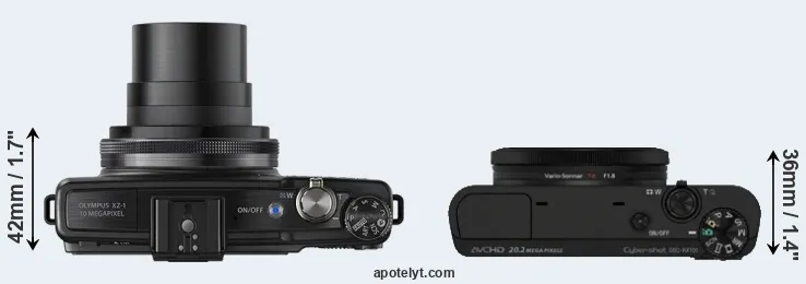 The physical size and weight of the Olympus XZ-1 and the Sony RX100 are illustrated in the side-by-side display below. The two cameras are presented according to their relative size. Three consecutive views from the front, the top, and the rear side are shown. All size dimensions are rounded to the nearest millimeter.