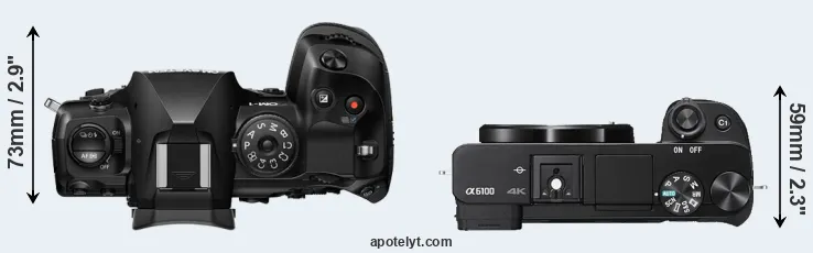 The physical size and weight of the OM System OM-1 II and the Sony A6100 are illustrated in the side-by-side display below. The two cameras are presented according to their relative size. Three successive views from the front, the top, and the rear are shown. All width, height and depth measures are rounded to the nearest millimeter.