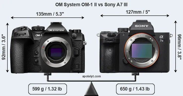 If the front view area (width x height) of the cameras is taken as an aggregate measure of their size, the Sony A7 III is somewhat smaller (2 percent) than the OM System OM-1 II. However, the A7 III is markedly heavier (9 percent) than the OM-1 II. In this context, it is worth noting that both cameras are splash and dust-proof and can, hence, be used in inclement weather conditions or harsh environments.