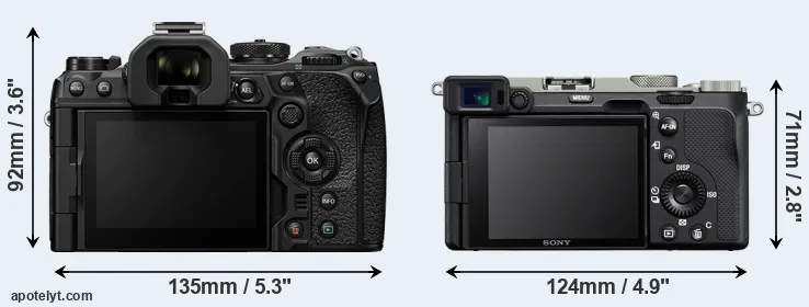 The side-by-side display below illustrates the physical size and weight of the OM System OM-1 II and the Sony A7C. The two cameras are presented according to their relative size. Three consecutive perspectives from the front, the top, and the back are available. All size dimensions are rounded to the nearest millimeter.