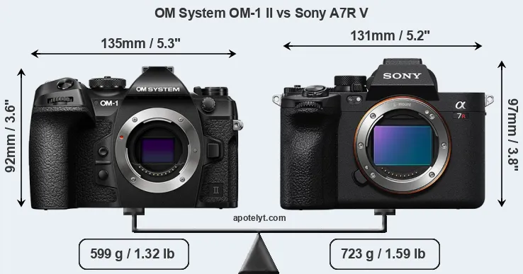 If the front view area (width x height) of the cameras is taken as an aggregate measure of their size, the Sony A7R V is somewhat larger (2 percent) than the OM System OM-1 II. Moreover, the A7R V is markedly heavier (21 percent) than the OM-1 II. In this context, it is worth noting that both cameras are splash and dust-proof and can, hence, be used in inclement weather conditions or harsh environments.