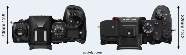An illustration of the physical size and weight of the OM System OM-1 II and the Sony A7R V is provided in the side-by-side display below. The two cameras are presented according to their relative size. Three successive views from the front, the top, and the rear are shown. All width, height and depth dimensions are rounded to the nearest millimeter.