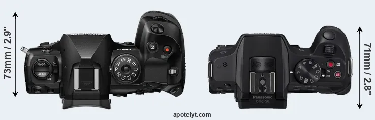 An illustration of the physical size and weight of the OM System OM-1 and the Panasonic G6 is provided in the side-by-side display below. The two cameras are presented according to their relative size. Three successive views from the front, the top, and the rear are shown. All size dimensions are rounded to the nearest millimeter.