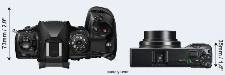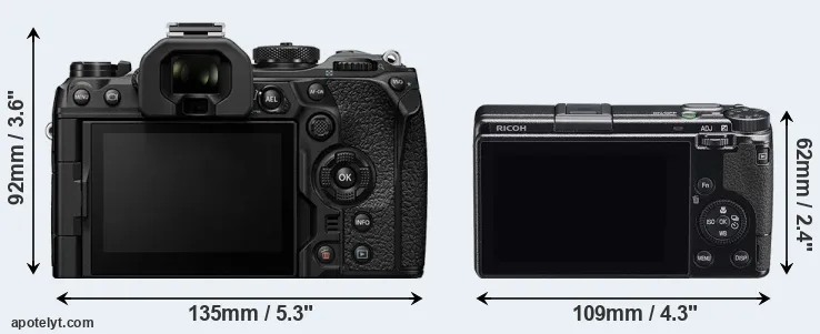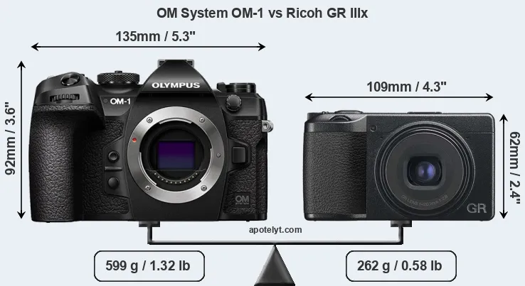 The side-by-side display below illustrates the physical size and weight of the OM System OM-1 and the Ricoh GR IIIx. The two cameras are presented according to their relative size. Three successive views from the front, the top, and the rear are shown. All width, height and depth dimensions are rounded to the nearest millimeter.