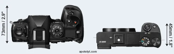 The side-by-side display below illustrates the physical size and weight of the OM System OM-1 and the Sony A6000. The two cameras are presented according to their relative size. Three consecutive perspectives from the front, the top, and the back are available. All size dimensions are rounded to the nearest millimeter.