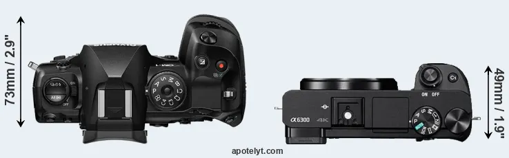 The side-by-side display below illustrates the physical size and weight of the OM System OM-1 and the Sony A6300. The two cameras are presented according to their relative size. Three consecutive perspectives from the front, the top, and the back are available. All size dimensions are rounded to the nearest millimeter.