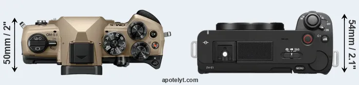 The physical size and weight of the OM System OM-5 II and the Sony ZV-E1 are illustrated in the side-by-side display below. The two cameras are presented according to their relative size. Three successive views from the front, the top, and the rear are shown. All width, height and depth measures are rounded to the nearest millimeter.