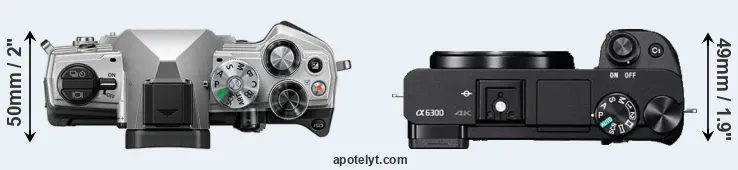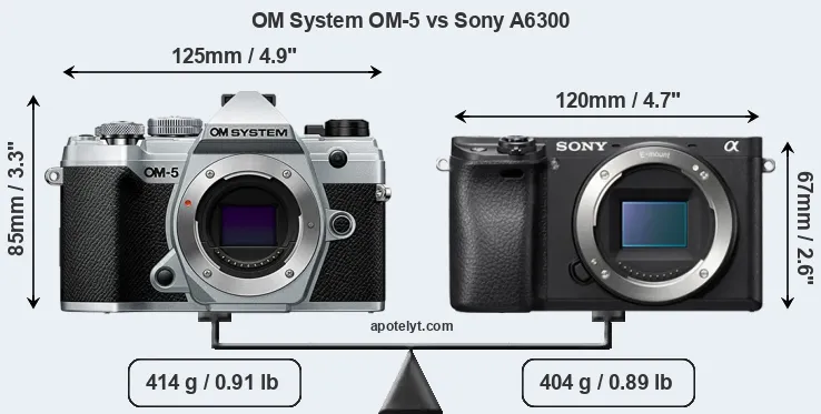 The side-by-side display below illustrates the physical size and weight of the OM System OM-5 and the Sony A6300. The two cameras are presented according to their relative size. Three consecutive perspectives from the front, the top, and the back are available. All width, height and depth measures are rounded to the nearest millimeter.