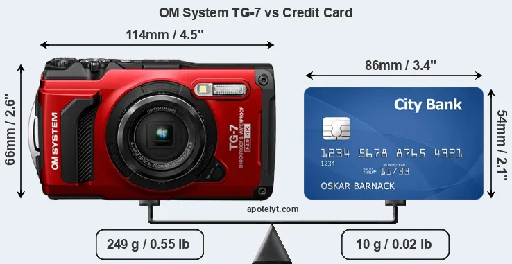 The physical dimensions of the OM System TG-7 relative to a credit card are illustrated in the side-by-side display below. Three successive views from the front, the top, and the rear are shown. All width, height and depth measures are rounded to the nearest millimeter.
