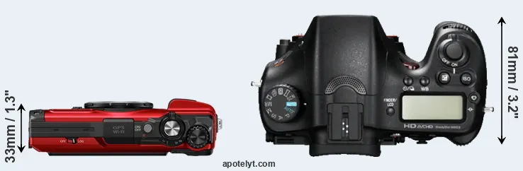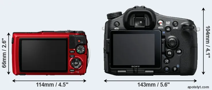 The above size and weight comparisons are to some extent incomplete and possibly misleading, as the TG-7 has a lens built in, whereas the A77 is an interchangeable lens camera that requires a separate lens. Attaching the latter will add extra weight and bulk to the setup.