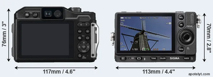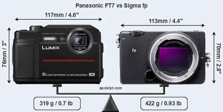 The Panasonic Lumix DC-FT7 (called Panasonic TS7 in some regions) and the Sigma fp are two digital cameras that were revealed to the public, respectively, in May 2018 and July 2019. The FT7 is a fixed lens compact, while the fp is a mirrorless interchangeable lens camera. The cameras are based on a 1/2.3-inch (FT7) and a full frame (fp) sensor. The Panasonic has a resolution of 20.2 megapixels, whereas the Sigma provides 24 MP.