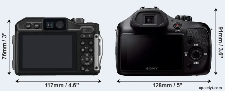 The side-by-side display below illustrates the physical size and weight of the Panasonic FT7 and the Sony A3000. The two cameras are presented according to their relative size. Three consecutive views from the front, the top, and the rear side are shown. All width, height and depth dimensions are rounded to the nearest millimeter.