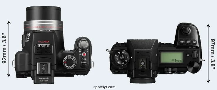 An illustration of the physical size and weight of the Panasonic FZ100 and the Panasonic S1 is provided in the side-by-side display below. The two cameras are presented according to their relative size. Three successive views from the front, the top, and the rear are shown. All size dimensions are rounded to the nearest millimeter.