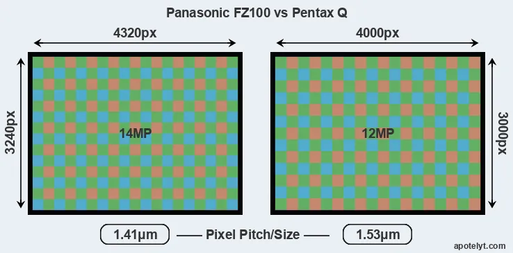 While the two cameras under review share the same sensor size, the FZ100 offers a higher resolution of 14 megapixels, compared with 12 MP of the Pentax Q. This megapixels advantage translates into a 8 percent gain in linear resolution. On the other hand, these sensor specs imply that the FZ100 has a higher pixel density and a smaller size of the individual pixel (with a pixel pitch of 1.41μm versus 1.53μm for the Pentax Q). Moreover, it should be noted that the Pentax Q is a somewhat more recent model (by 11 months) than the FZ100, and its sensor might have benefitted from technological advances during this time that further enhance the light gathering capacity of individual pixels. Coming back to sensor resolution, it should be mentioned that the FZ100 has no anti-alias filter installed, so that it can capture all the detail its sensor resolves.