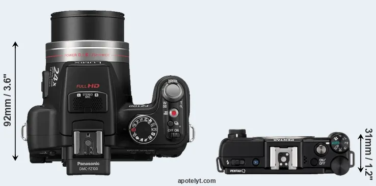 An illustration of the physical size and weight of the Panasonic FZ100 and the Pentax Q is provided in the side-by-side display below. The two cameras are presented according to their relative size. Three consecutive perspectives from the front, the top, and the back are available. All size dimensions are rounded to the nearest millimeter.
