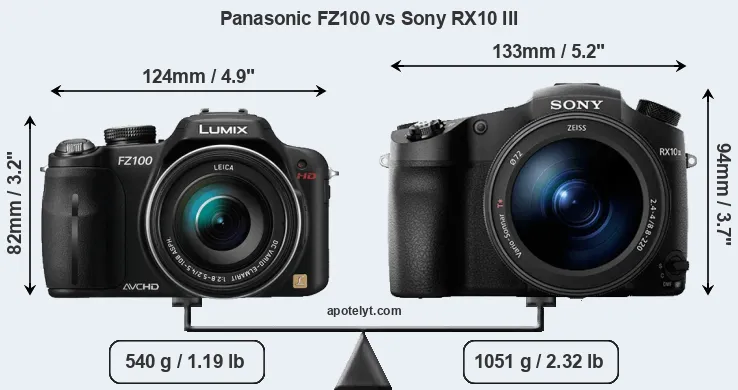 If the front view area (width x height) of the cameras is taken as an aggregate measure of their size, the Sony RX10 III is notably larger (23 percent) than the Panasonic FZ100. Moreover, the RX10 III is substantially heavier (95 percent) than the FZ100. It is noteworthy in this context that the RX10 III is splash and dust-proof, while the FZ100 does not feature any corresponding weather-sealing.