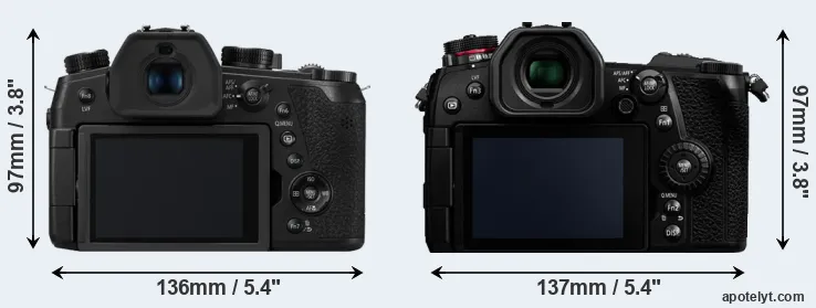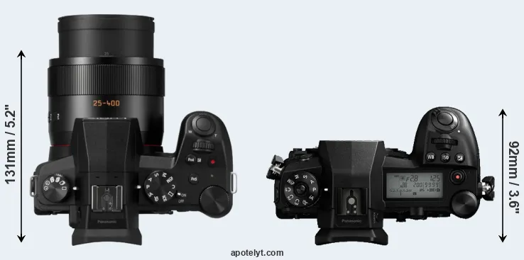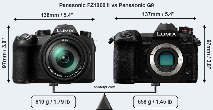 The side-by-side display below illustrates the physical size and weight of the Panasonic FZ1000 II and the Panasonic G9. The two cameras are presented according to their relative size. Three consecutive perspectives from the front, the top, and the back are available. All width, height and depth measures are rounded to the nearest millimeter.