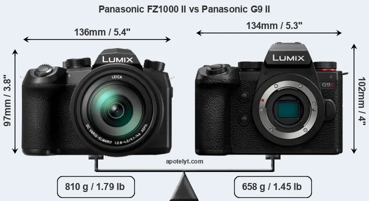 An illustration of the physical size and weight of the Panasonic FZ1000 II and the Panasonic G9 II is provided in the side-by-side display below. The two cameras are presented according to their relative size. Three successive views from the front, the top, and the rear are shown. All width, height and depth dimensions are rounded to the nearest millimeter.