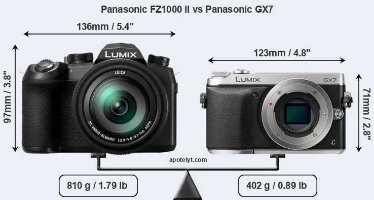 An illustration of the physical size and weight of the Panasonic FZ1000 II and the Panasonic GX7 is provided in the side-by-side display below. The two cameras are presented according to their relative size. Three successive views from the front, the top, and the rear are shown. All width, height and depth measures are rounded to the nearest millimeter.