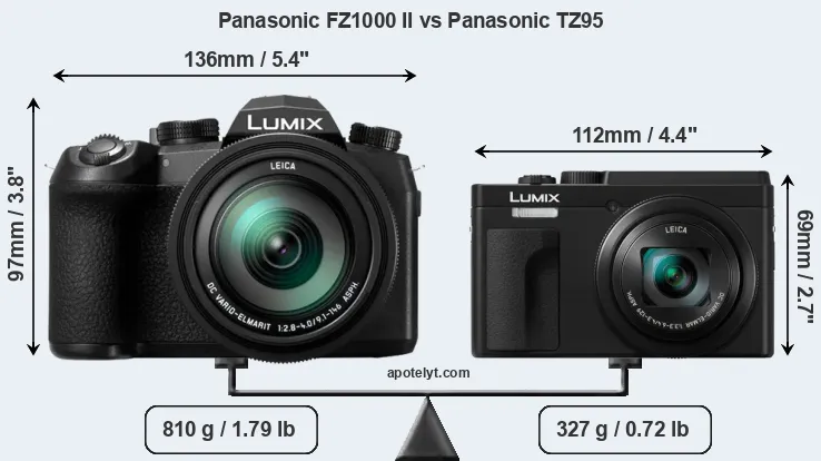 An illustration of the physical size and weight of the Panasonic FZ1000 II and the Panasonic TZ95 is provided in the side-by-side display below. The two cameras are presented according to their relative size. Three consecutive perspectives from the front, the top, and the back are available. All size dimensions are rounded to the nearest millimeter.