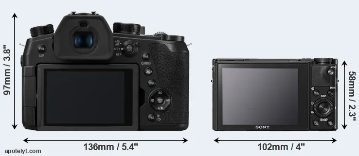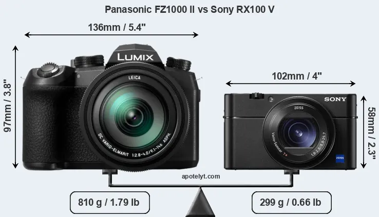 The side-by-side display below illustrates the physical size and weight of the Panasonic FZ1000 II and the Sony RX100 V. The two cameras are presented according to their relative size. Three consecutive perspectives from the front, the top, and the back are available. All width, height and depth dimensions are rounded to the nearest millimeter.