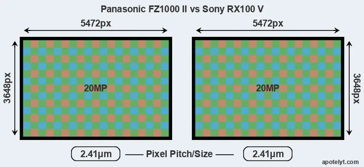 The two cameras under review do not only share the same sensor size, but also offer an identical resolution of 20 megapixels. This similarity in sensor specs implies that both the FZ1000 II and the RX100 V have the same pixel density, as well as the same pixel size. It should, however, be noted that the FZ1000 II is much more recent (by 2 years and 4 months) than the RX100 V, and its sensor will have benefitted from technological advances during this time.