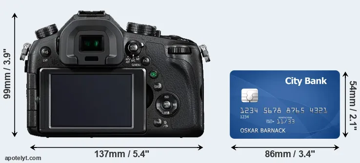 An illustration of the physical dimensions of the Panasonic FZ1000 vis-à-vis a credit card is provided in the side-by-side display below. Three consecutive perspectives from the front, the top, and the back are presented. All size dimensions are rounded to the nearest millimeter.