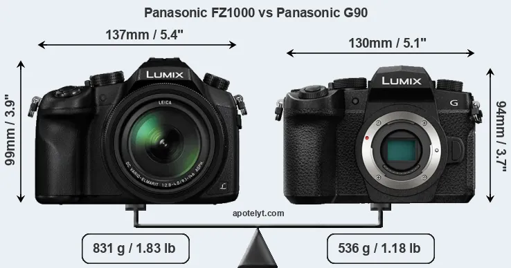 An illustration of the physical size and weight of the Panasonic FZ1000 and the Panasonic G90 is provided in the side-by-side display below. The two cameras are presented according to their relative size. Three successive views from the front, the top, and the rear are shown. All width, height and depth measures are rounded to the nearest millimeter.