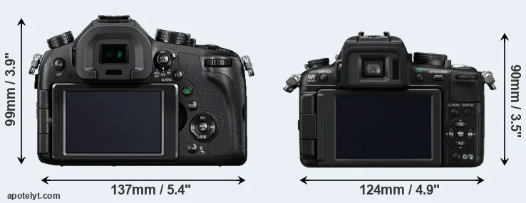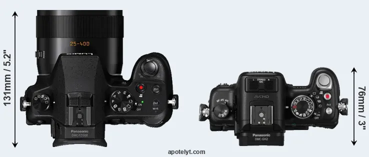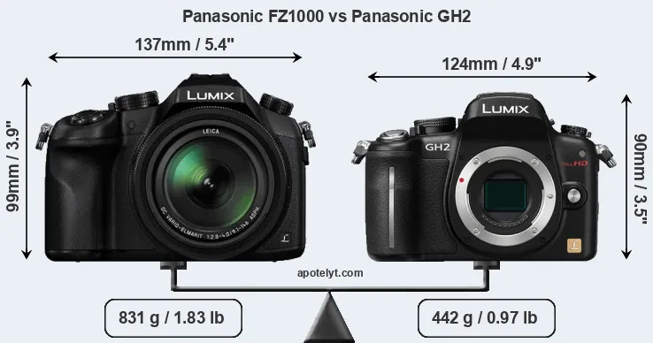 The side-by-side display below illustrates the physical size and weight of the Panasonic FZ1000 and the Panasonic GH2. The two cameras are presented according to their relative size. Three consecutive perspectives from the front, the top, and the back are available. All width, height and depth measures are rounded to the nearest millimeter.