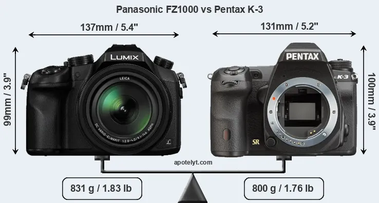 The above size and weight comparisons are to some extent incomplete and possibly misleading, as the FZ1000 has a lens built in, whereas the K-3 is an interchangeable lens camera that requires a separate lens. Attaching the latter will add extra weight and bulk to the setup.