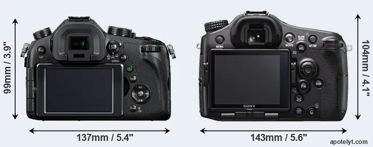 The side-by-side display below illustrates the physical size and weight of the Panasonic FZ1000 and the Sony A77 II. The two cameras are presented according to their relative size. Three consecutive views from the front, the top, and the rear side are shown. All width, height and depth dimensions are rounded to the nearest millimeter.