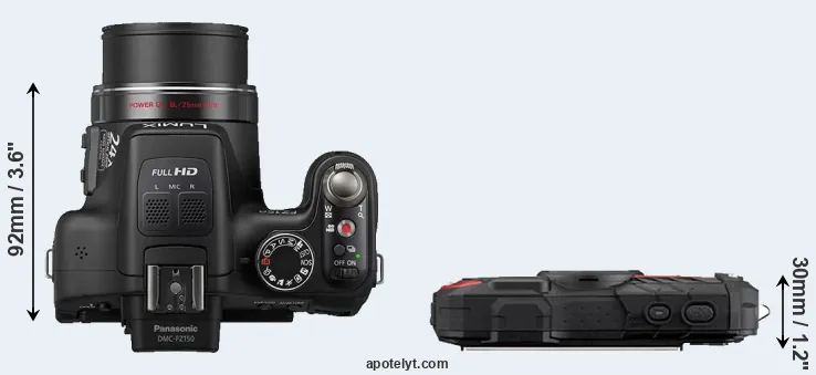 An illustration of the physical size and weight of the Panasonic FZ150 and the Ricoh WG-60 is provided in the side-by-side display below. The two cameras are presented according to their relative size. Three successive views from the front, the top, and the rear are shown. All size dimensions are rounded to the nearest millimeter.