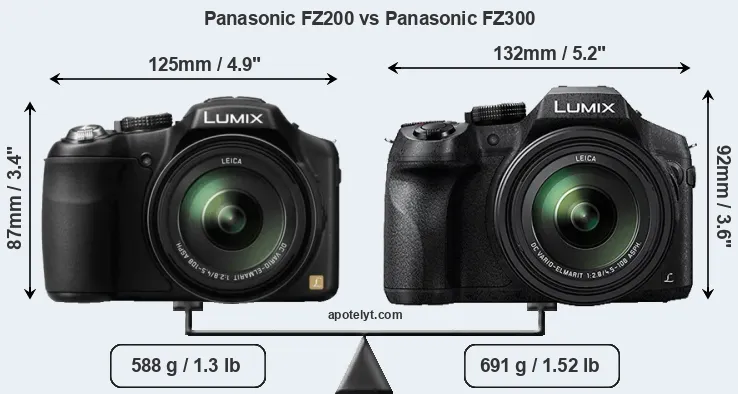 An illustration of the physical size and weight of the Panasonic FZ200 and the Panasonic FZ300 is provided in the side-by-side display below. The two cameras are presented according to their relative size. Three consecutive perspectives from the front, the top, and the back are available. All width, height and depth measures are rounded to the nearest millimeter.