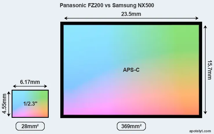 Of the two cameras under consideration, the Panasonic FZ200 features a 1/2.3-inch sensor and the Samsung NX500 an APS-C sensor. The sensor area in the NX500 is 1218 percent bigger. As a result of these sensor size differences, the cameras have a format factor of, respectively, 5.6 and 1.5. The sensor in the FZ200 has a native 4:3 aspect ratio, while the one in the NX500 offers a 3:2 aspect.