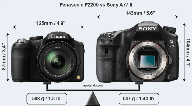 The physical size and weight of the Panasonic FZ200 and the Sony A77 II are illustrated in the side-by-side display below. The two cameras are presented according to their relative size. Three successive views from the front, the top, and the rear are shown. All width, height and depth measures are rounded to the nearest millimeter.