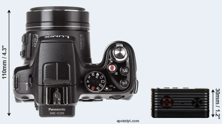 The side-by-side display below illustrates the physical size and weight of the Panasonic FZ200 and the Sony RX0. The two cameras are presented according to their relative size. Three consecutive views from the front, the top, and the rear side are shown. All size dimensions are rounded to the nearest millimeter.
