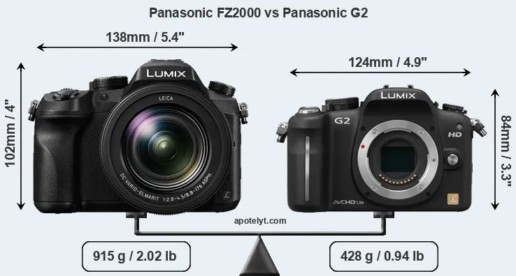 An illustration of the physical size and weight of the Panasonic FZ2000 and the Panasonic G2 is provided in the side-by-side display below. The two cameras are presented according to their relative size. Three consecutive perspectives from the front, the top, and the back are available. All width, height and depth measures are rounded to the nearest millimeter.
