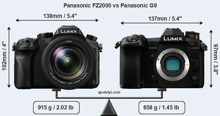 An illustration of the physical size and weight of the Panasonic FZ2000 and the Panasonic G9 is provided in the side-by-side display below. The two cameras are presented according to their relative size. Three successive views from the front, the top, and the rear are shown. All width, height and depth dimensions are rounded to the nearest millimeter.
