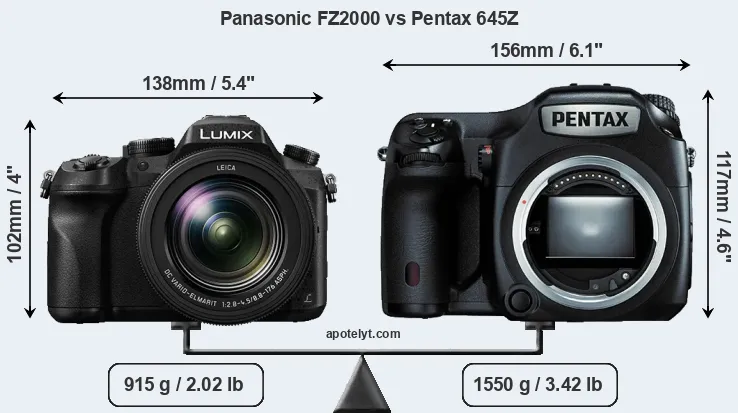 If the front view area (width x height) of the cameras is taken as an aggregate measure of their size, the Pentax 645Z is notably larger (30 percent) than the Panasonic FZ2000. It is noteworthy in this context that the 645Z is splash and dust-proof, while the FZ2000 does not feature any corresponding weather-sealing.