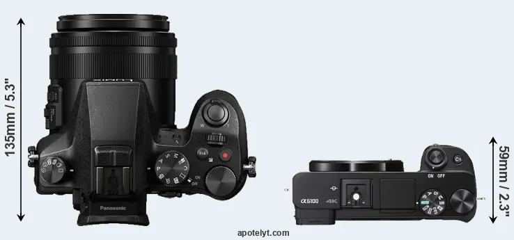 The side-by-side display below illustrates the physical size and weight of the Panasonic FZ2000 and the Sony A6100. The two cameras are presented according to their relative size. Three consecutive views from the front, the top, and the rear side are shown. All size dimensions are rounded to the nearest millimeter.