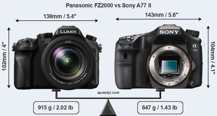 An illustration of the physical size and weight of the Panasonic FZ2000 and the Sony A77 II is provided in the side-by-side display below. The two cameras are presented according to their relative size. Three consecutive perspectives from the front, the top, and the back are available. All width, height and depth dimensions are rounded to the nearest millimeter.