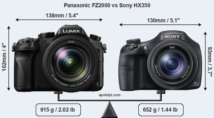 The physical size and weight of the Panasonic FZ2000 and the Sony HX350 are illustrated in the side-by-side display below. The two cameras are presented according to their relative size. Three consecutive views from the front, the top, and the rear side are shown. All size dimensions are rounded to the nearest millimeter.