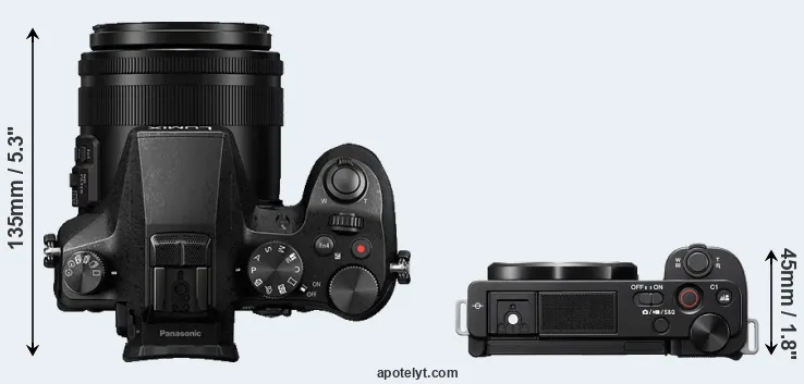 The side-by-side display below illustrates the physical size and weight of the Panasonic FZ2000 and the Sony ZV-E10. The two cameras are presented according to their relative size. Three consecutive perspectives from the front, the top, and the back are available. All size dimensions are rounded to the nearest millimeter.