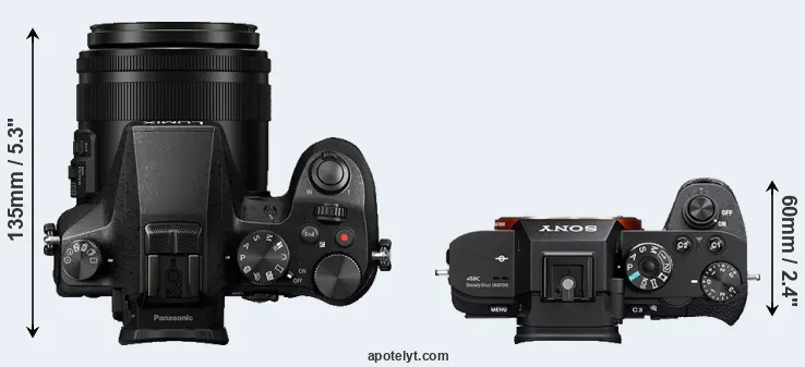 The side-by-side display below illustrates the physical size and weight of the Panasonic FZ2500 and the Sony A7S II. The two cameras are presented according to their relative size. Three consecutive views from the front, the top, and the rear side are shown. All size dimensions are rounded to the nearest millimeter.