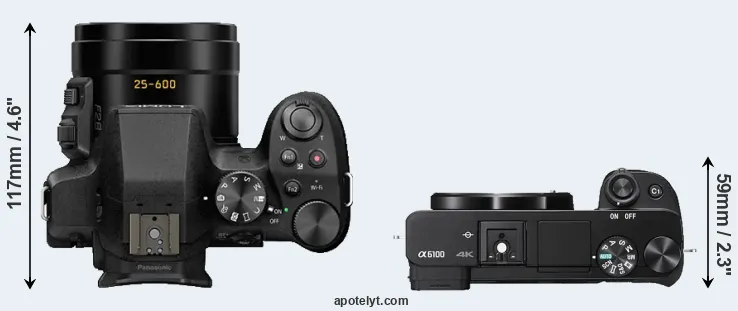 The physical size and weight of the Panasonic FZ300 and the Sony A6100 are illustrated in the side-by-side display below. The two cameras are presented according to their relative size. Three successive views from the front, the top, and the rear are shown. All width, height and depth measures are rounded to the nearest millimeter.