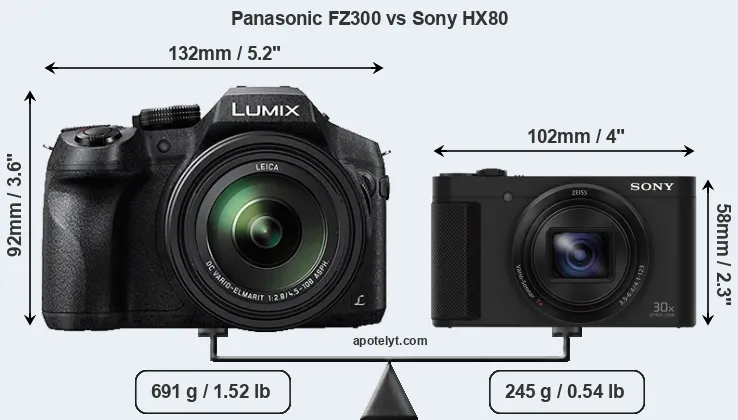 The physical size and weight of the Panasonic FZ300 and the Sony HX80 are illustrated in the side-by-side display below. The two cameras are presented according to their relative size. Three consecutive perspectives from the front, the top, and the back are available. All width, height and depth measures are rounded to the nearest millimeter.
